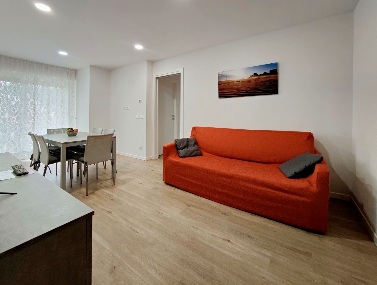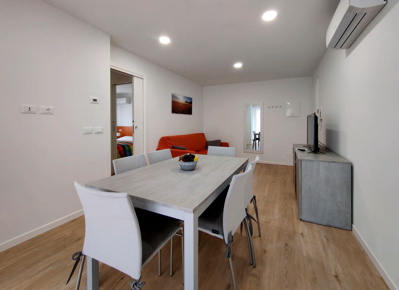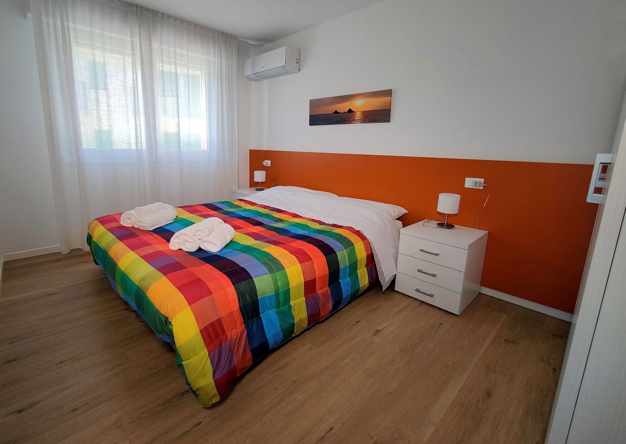 Gli appartamenti, perfettamente uguali tra loro, sono situati al 2° e 3° piano di una palazzina di 4 piani, sono raggiungibili tramite scale e dispongono di: aria condizionata in soggiorno e nelle due camere, porta d’ingresso blindata, Smart TV con canali satellitari, lavatrice, lavastoviglie, macchina del caffè Nespresso, forno a microonde, bollitore, tostapane, zanzariere, persiane elettriche e Wi Fi. Possono ospitare fino a 5 persone.