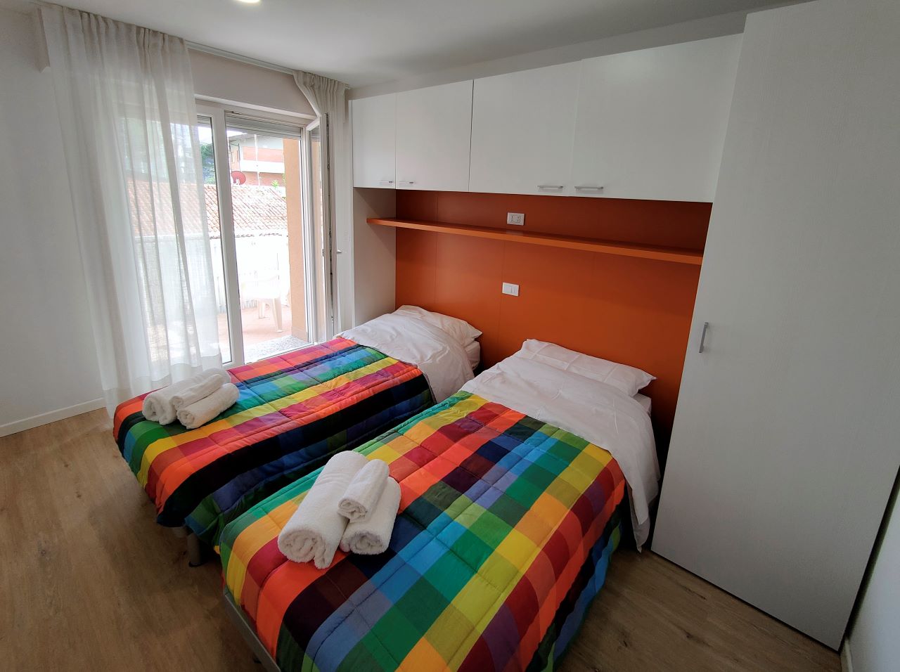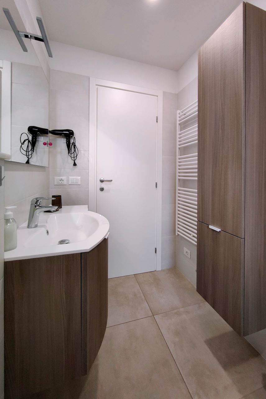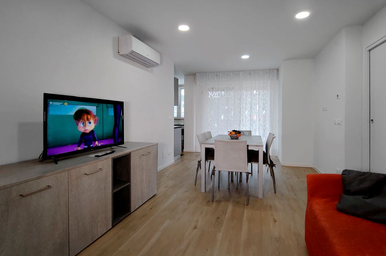 Gli appartamenti, perfettamente uguali tra loro, sono situati al 2° e 3° piano di una palazzina di 4 piani, sono raggiungibili tramite scale e dispongono di: aria condizionata in soggiorno e nelle due camere, porta d’ingresso blindata, Smart TV con canali satellitari, lavatrice, lavastoviglie, macchina del caffè Nespresso, forno a microonde, bollitore, tostapane, zanzariere, persiane elettriche e Wi Fi. Possono ospitare fino a 5 persone.